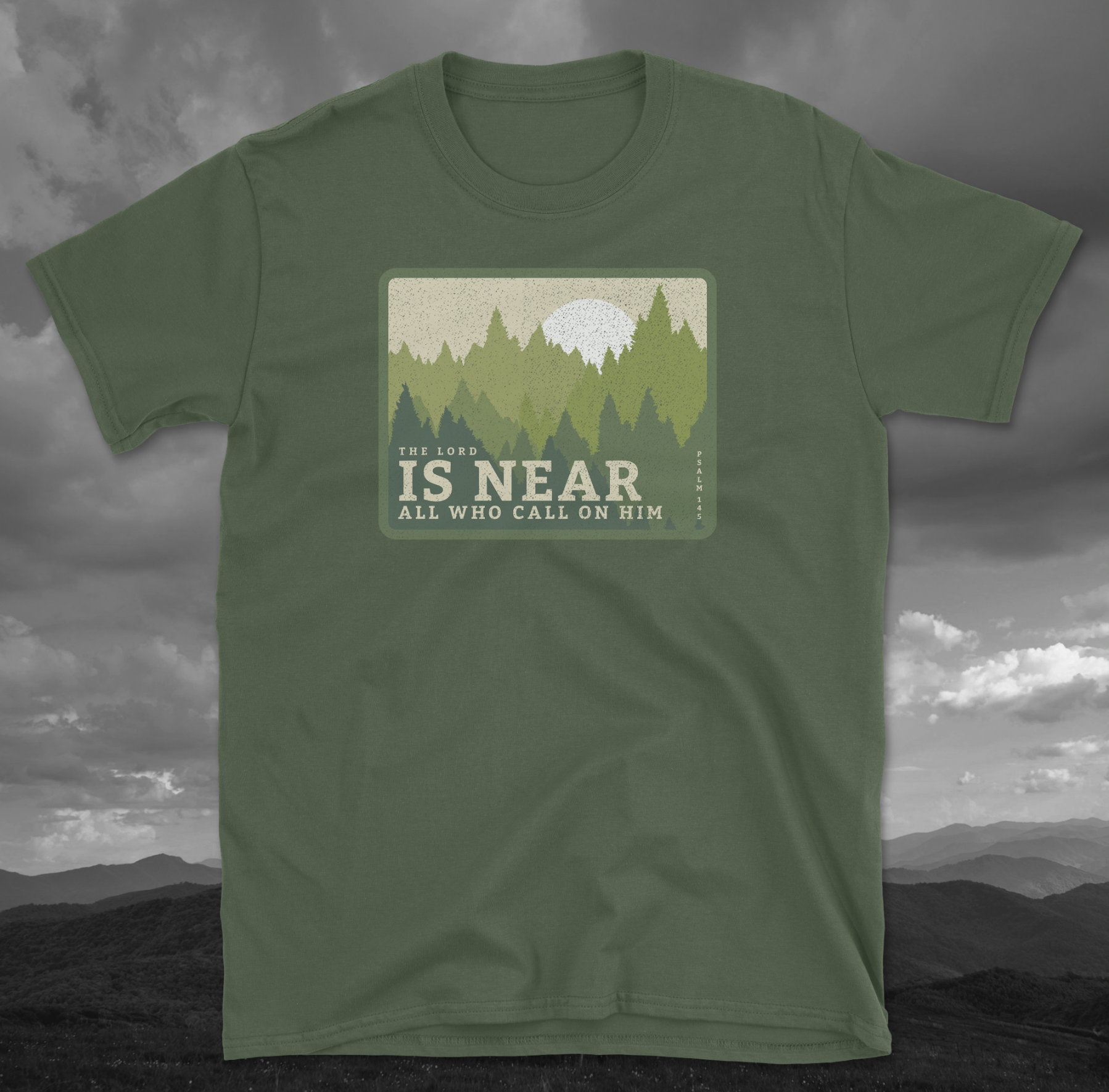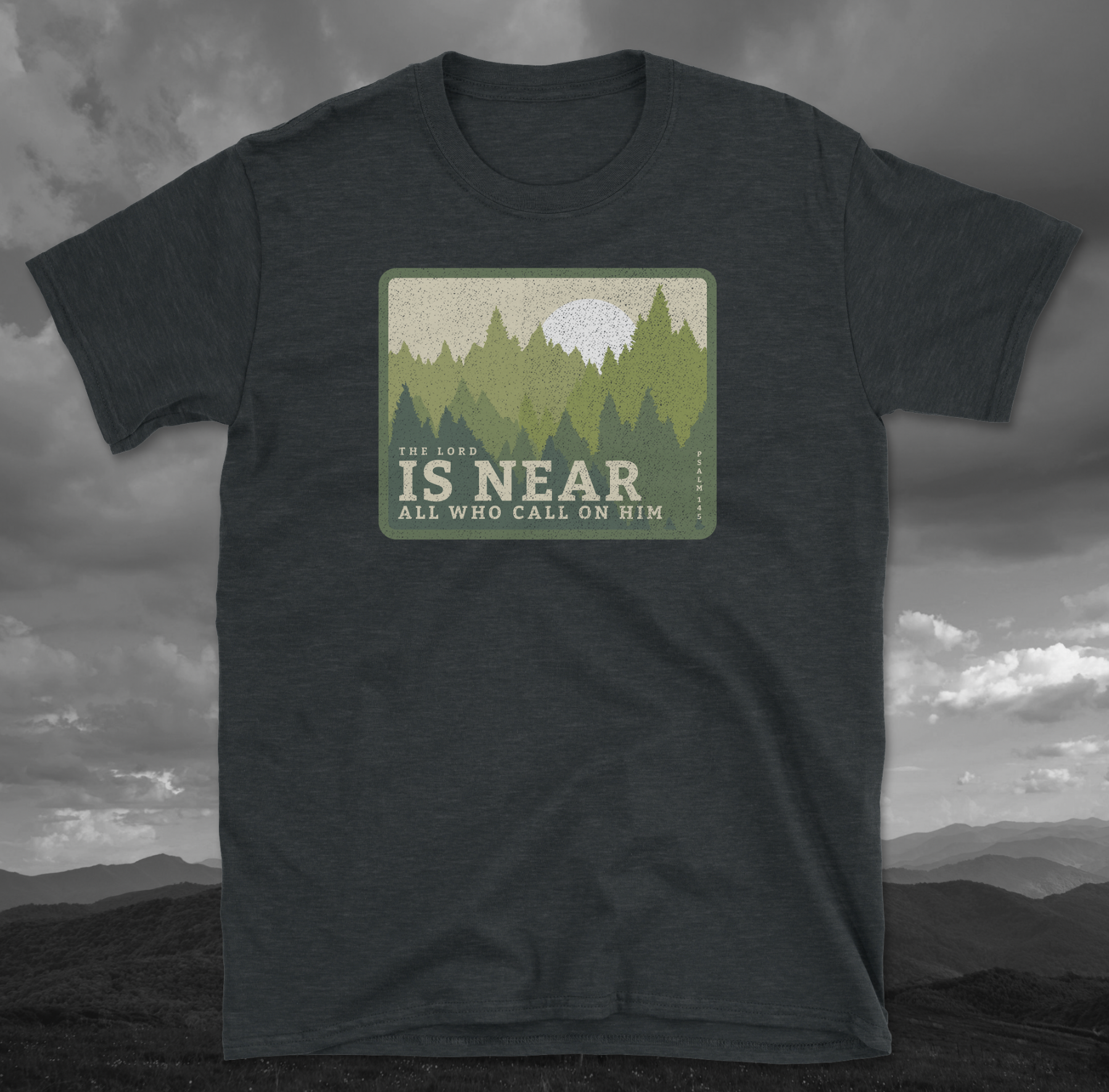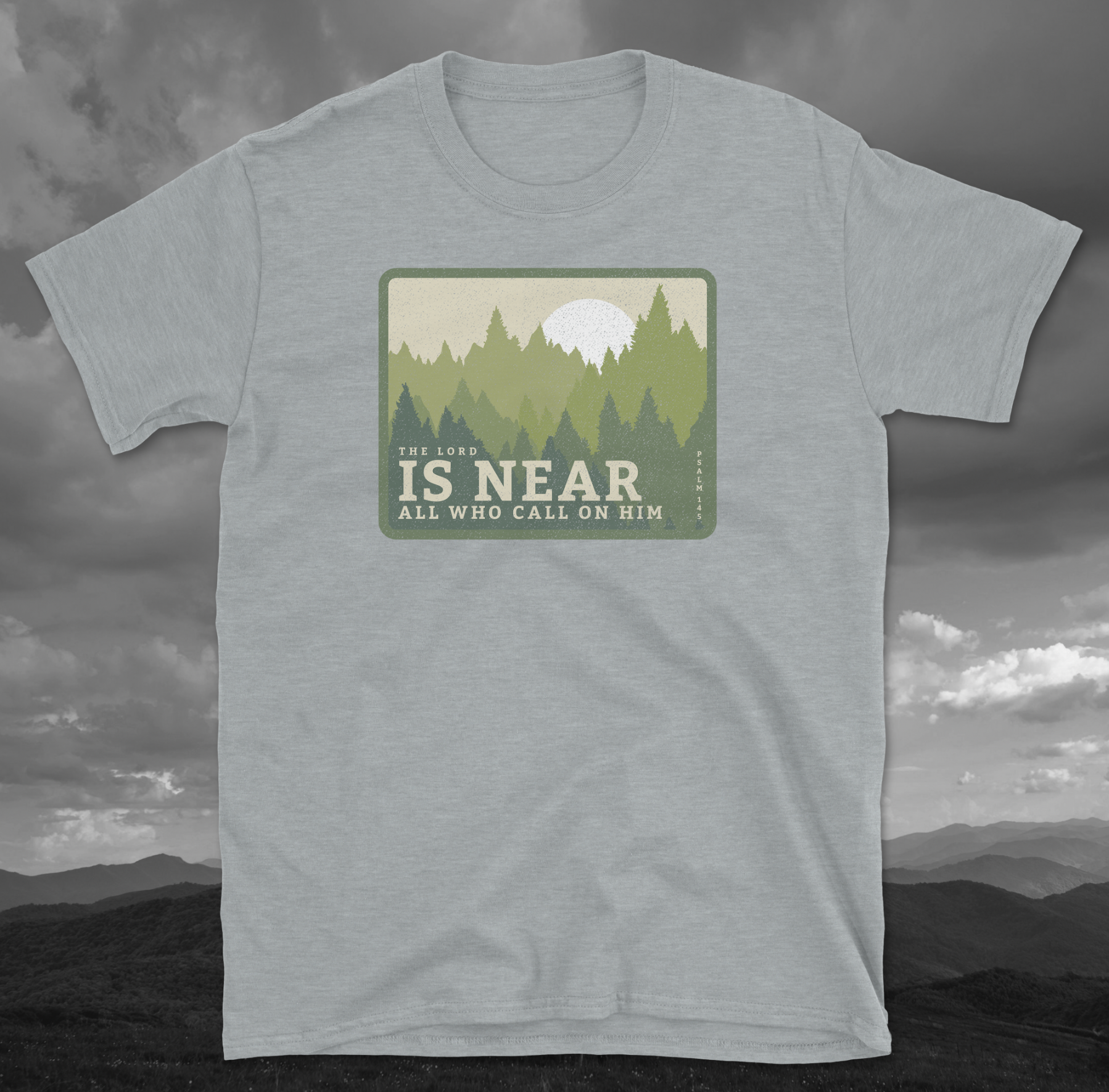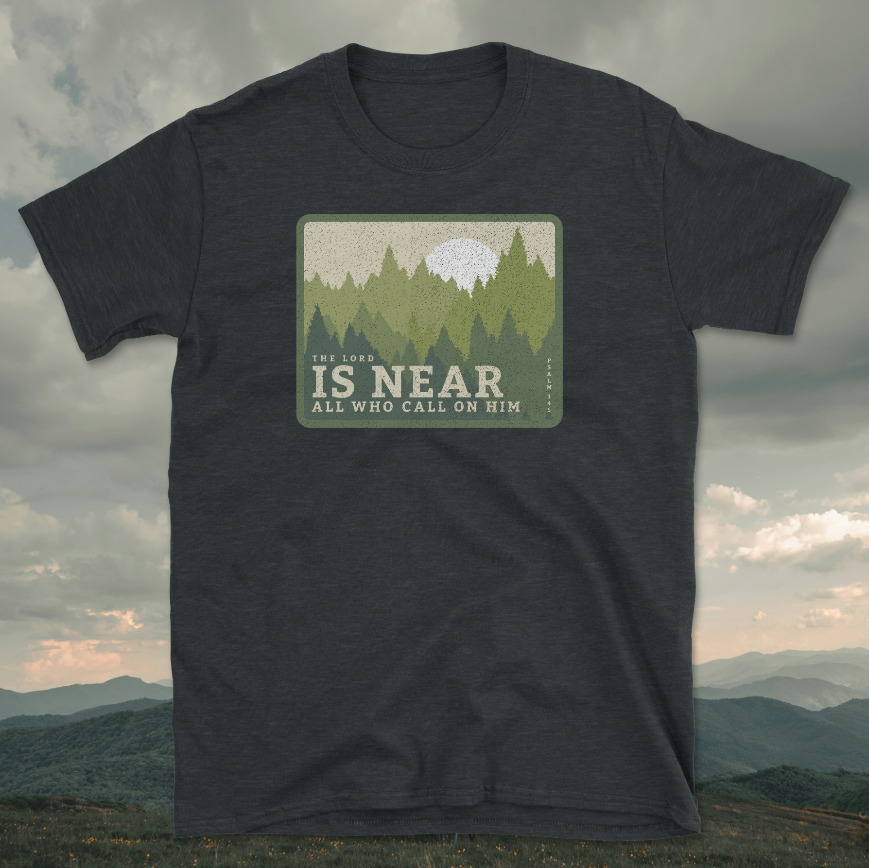 Soft, breathable, and quietly uplifting — this lightweight tee brings a calm forest morning into your everyday. The retro-style patch print shows a sun rising above a layered pine silhouette with the gentle line “IS NEAR / ALL WHO CALL ON HIM,” creating a humble, contemplative vibe. Wear it on walks through damp trails, to small group meetups, or while sipping coffee by a window as the day wakes. The crew neck and classic cut keep the silhouette simple so the message and scenery remain the focus. It pairs easily with worn jeans, a flannel tied at the waist, or under a favorite jacket when nights turn cool.